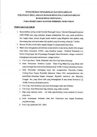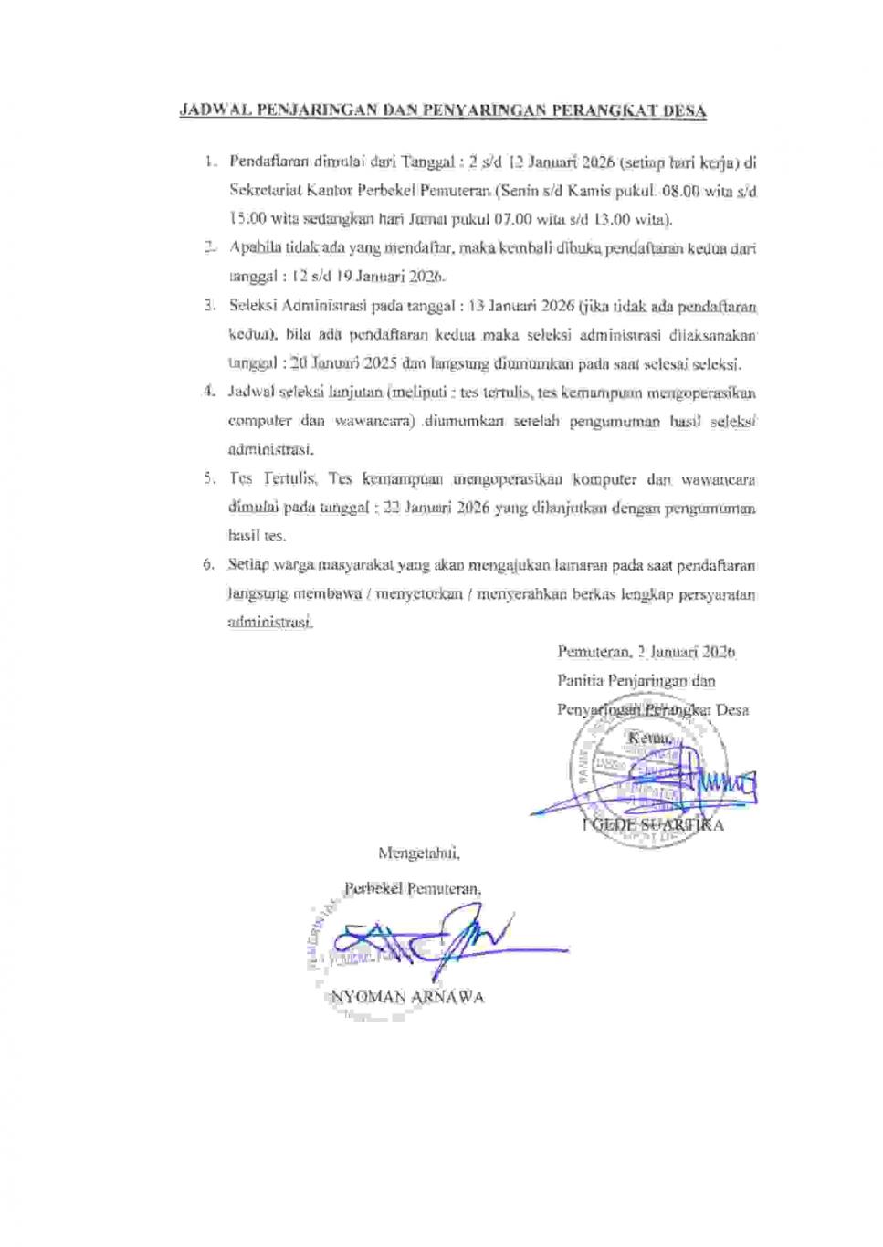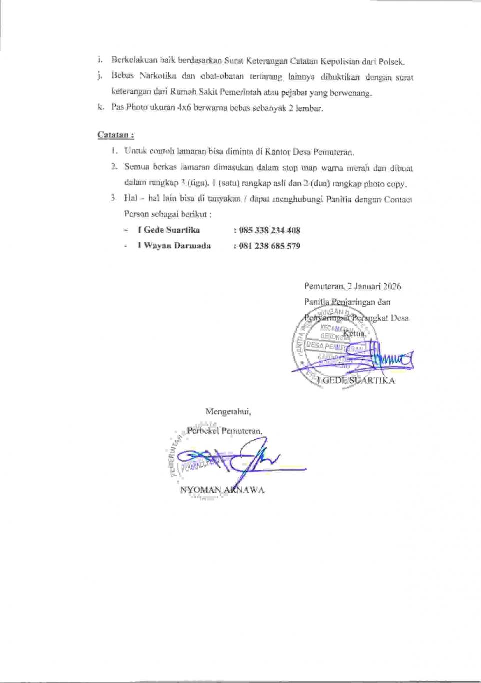 Dengan ini kami sampaikan Pengumuman Penjaringan dan Penyaringan Perangkat Desa ( Kelian Banjar Dinas Yeh Panas dan Kelian Banjar Dinas Palasari) pada Sekretariat Kantor Perbekel Pemuteran. Untuk Persyaratan dan Kelengkapan Administrasi lainnya bisa dilihat pada Foto Terlampir.