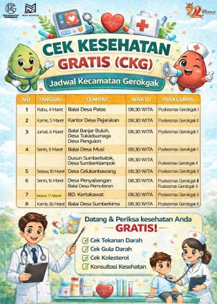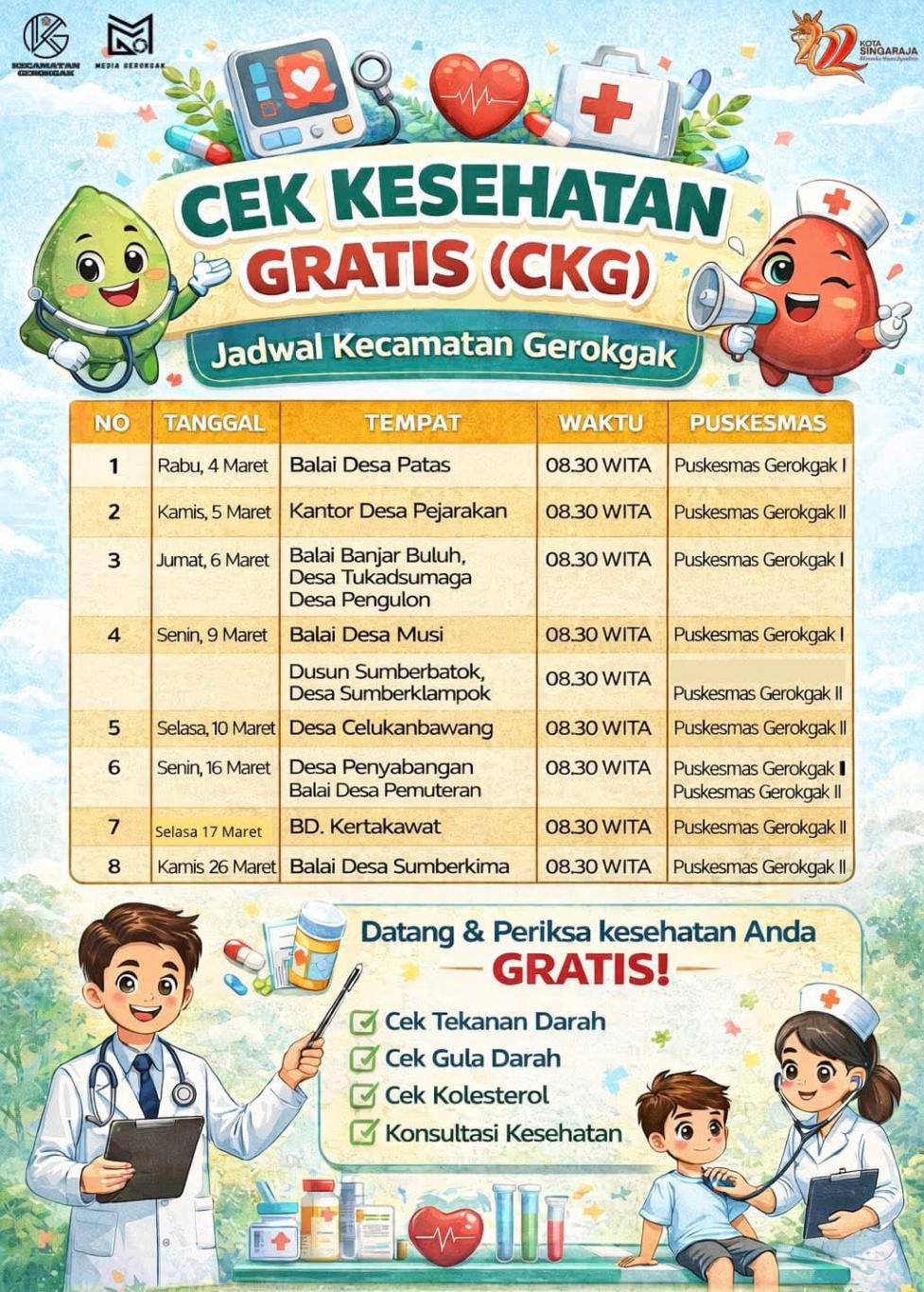 Diinformasikan Kepada Seluruh Masyarakat Desa Pemuteran Untuk Datang Ke Balai Desa Pemuteran Dalam Kegiatan Cek Kesehatan Gratis (CKG) Pada Hari Senin, 16 Maret 2026