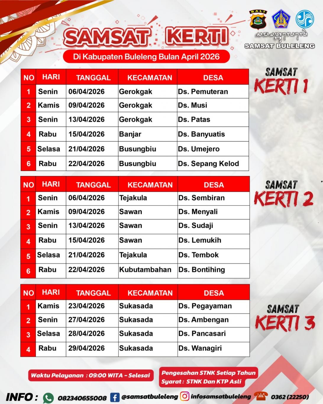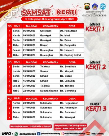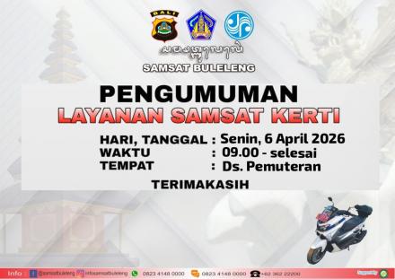 Diinformasikan kepada Seluruh Masyarakat Desa Pemuteran untuk datang ke Balai Desa Pemuteran dalam Kegiatan Samsat Kerti yang akan dilaksanakan pada Hari Senin, 06 April 2026